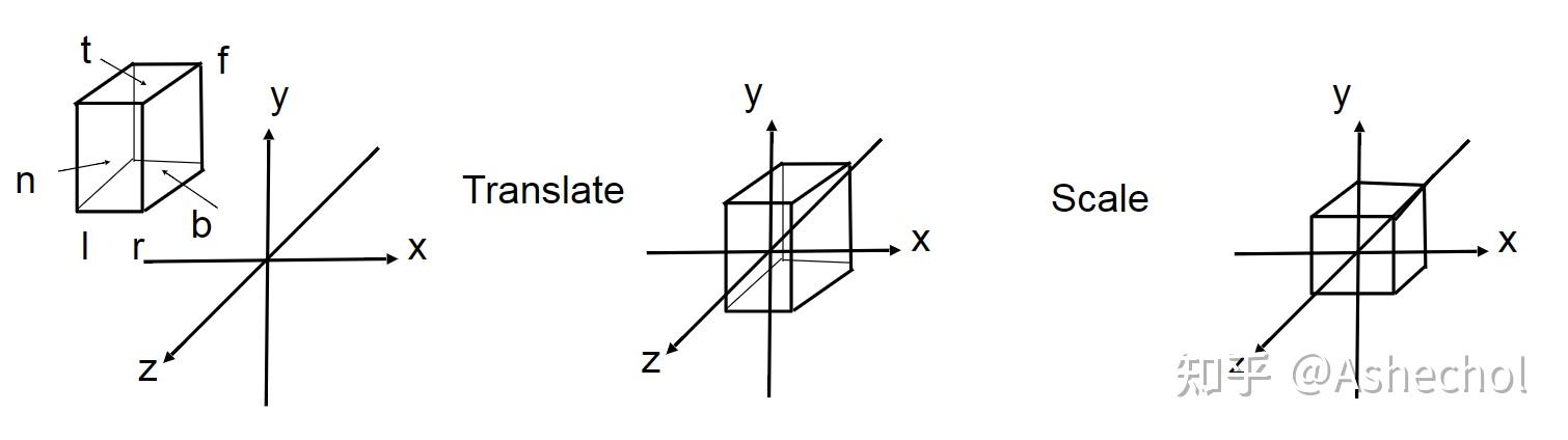 先把视椎内物体进行一个透视投影,压缩到一个非透视的空间内,然后使用正交投影,将视椎内物体压缩到各维度为[-1,1]的空间内。